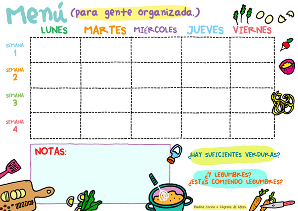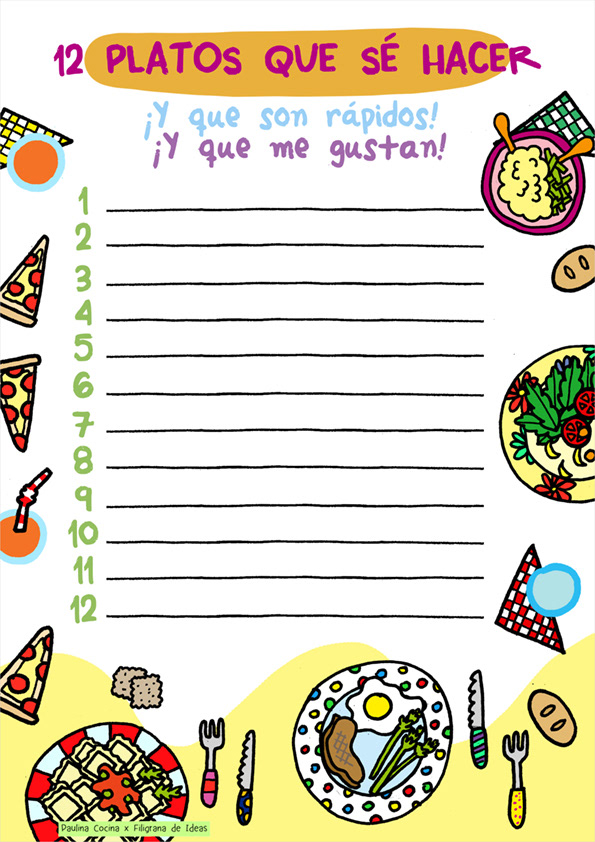 Ilustración y diseño de lista de lista de platos, lista de compras y calendario de comidas para Paulina Cocina.